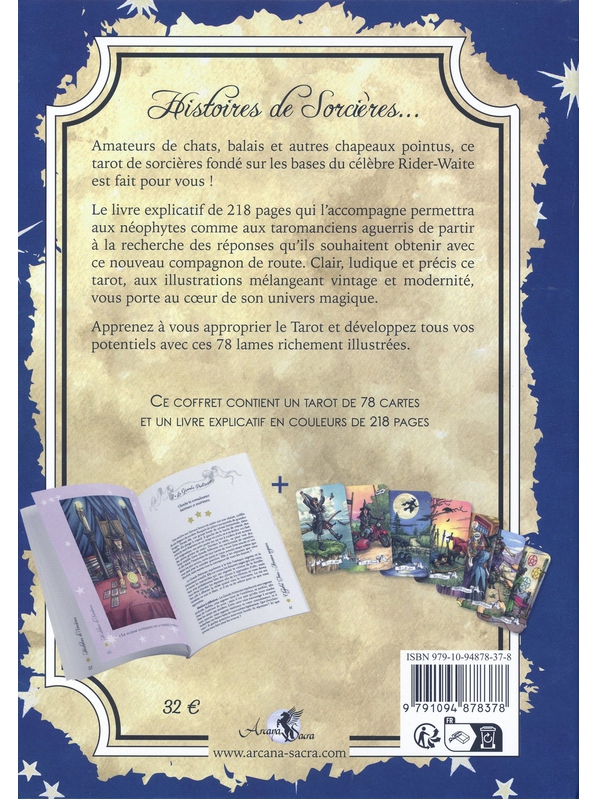 Amateurs de chats, balais et autre chapeaux pointus, ce tarot de sorcières fondé sur les bases du célèbre Rider-Waite est fait pour vous ! Le livre explicatif de 218 pages qui l'accompagne permettra aux néophytes comme aux taromanciens aguerris de partir à la recherche des réponses qu'ils souhaitent