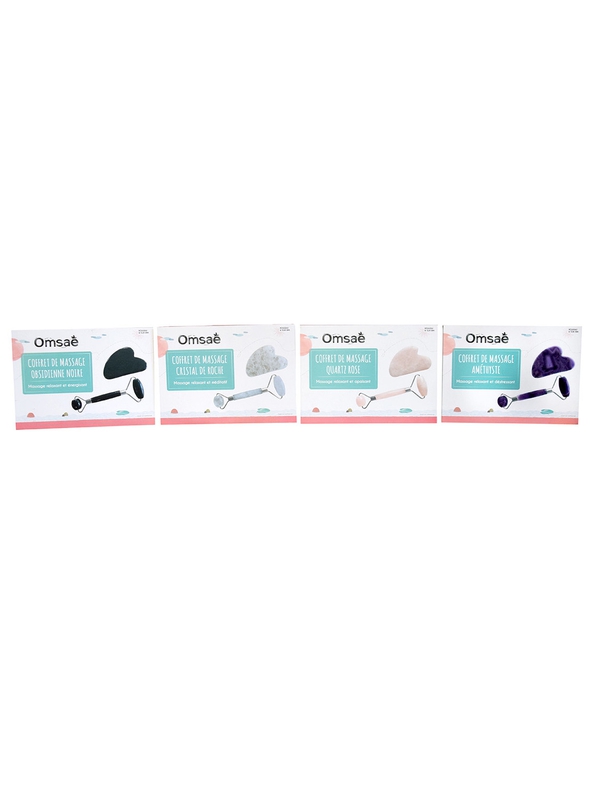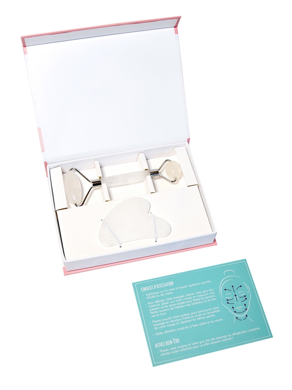 Coffret de massage composé d'un rouleau finition argentée et d'un gua sha en pierre naturelle de cristal de roche. Hérités des rituels de soin et de beauté chinois traditionnels, ce rouleau et ce gua sha permettent d'améliorer l'apparence de la peau et de se libérer des tensions par un massage alliant douceur et tonicité. Le rouleau est doté de deux pierres de tailles différentes, idéales pour masser toutes les zones du visage. Le gua sha viendra sculpter et lifter les traits grâce à sa forme spécifique, pensée pour épouser les lignes du visage. Le cristal de roche, pierre propice à la méditation, viendra renforcer les bienfaits du massage.