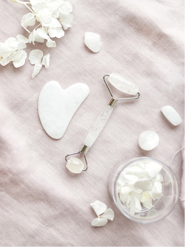 Coffret de massage composé d'un rouleau finition argentée et d'un gua sha en pierre naturelle de cristal de roche. Hérités des rituels de soin et de beauté c