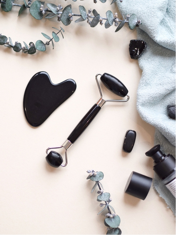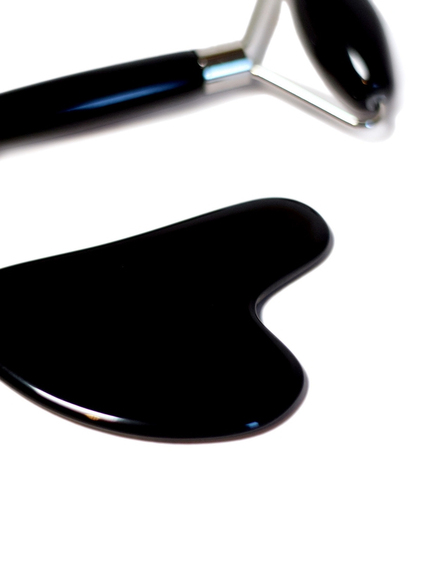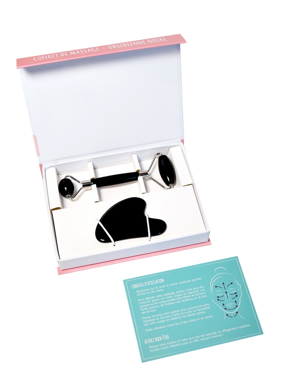 Coffret de massage composé d'un rouleau finition argentée et d'un gua sha en pierre naturelle d'obsidienne noire. Hérités des rituels de soin et de beauté ch