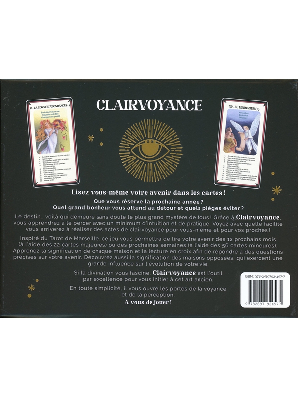 Le destin… voilà qui demeure sans doute le plus grand mystère de tous ! Grâce à « Clairvoyance », vous apprendrez à le percer avec un minimum d’intuition et de pratique. Voyez avec quelle facilité vous arriverez à réaliser des actes de clairvoyance pour vous-même et pour vos proches ! Inspiré du Tar
