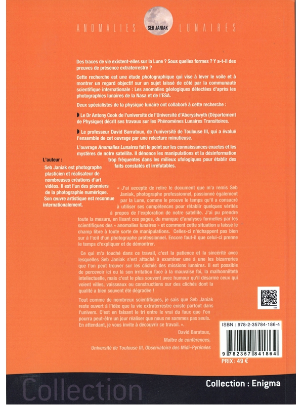 Des traces de vie existent-elles sur la Lune ? Sous quelles formes ? Y a-t-il des preuves de présence extraterrestre ? Cet ouvrage fait le point sur les connaissances exactes et les mystères de notre satellite. Il dénonce les manipulations et la désinformation trop fréquentes dans les milieux ufologiques pour établir des faits constatés et irréfutables. Il se présente sous la forme d'une étude photographique qui vise à lever le voile et à montrer un regard objectif sur un sujet laissé de côté par la communauté scientifique internationale : les anomalies géologiques détectées d'après les photographies lunaires de la Nasa et de l'ESA. Deux spécialistes de la physique lunaire ont collaboré à cette recherche : le docteur Antony Cook de l'université d'Aberystwyth (Département de Physique) décrit ses travaux sur les Phénomènes Lunaires Transitoires , le professeur David Baratoux, de l'université de Toulouse III, a évalué lui l'ensemble de cet ouvrage par une relecture minutieuse.Janiak Seb Voir moins