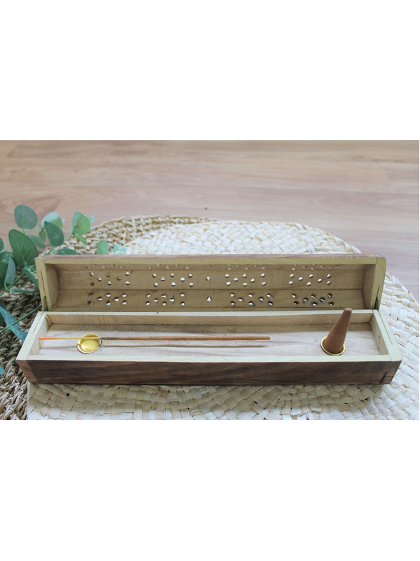 Boîte porte-encens en bois avec une forme semi-hexagonale adaptée aux bâtons d'encens. Créer une ambiance olfactive douce et apaisante