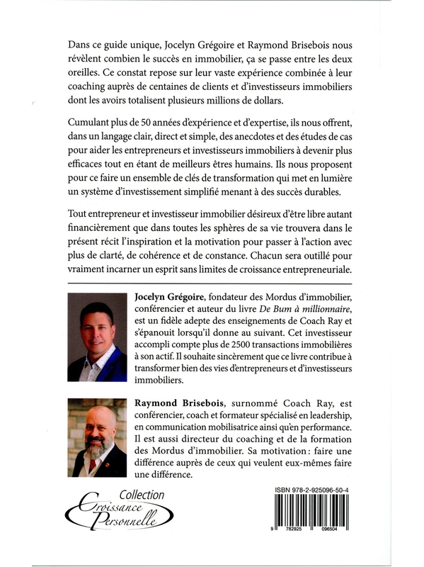 Dans ce guide unique, Jocelyn Grégoire et Raymond Brisebois nous révèlent combien le succès en immobilier, ça se passe entre les deux oreilles. Ce constat repose sur leur vaste expérience combinée à leur coaching auprès de centaines de clients et d’investisseurs immobiliers dont les avoirs totalisen