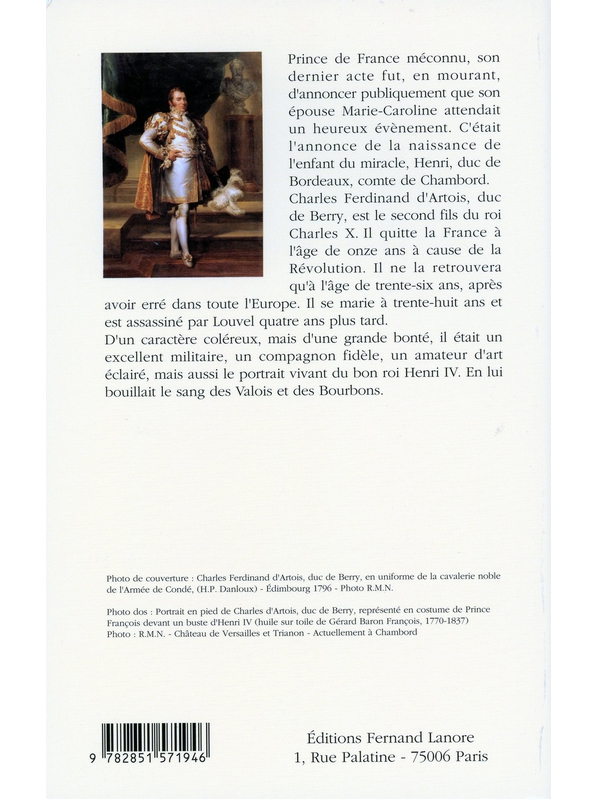Prince de France méconnu, son dernier acte fut, en mourant, d'annoncer publiquement que son épouse Marie-Caroline attendait un heureux événement. C'était l'annonce de la naissance de l'enfant du miracle, Henri, duc de Bordeaux, comte de Chambord. Charles Ferdinand d'Artois, duc de Berry, est le second fils du roi Charles X. Il quitte la France à l'âge de onze ans à cause de la Révolution. Il ne la retrouvera qu'à l'âge de trente-six ans, après avoir erré dans toute l'Europe. Il se marie à trente-huit ans et est assassiné par Louvel quatre ans plus tard. D'un caractère coléreux, mais d'une grande bonté, il était un excellent militaire, un compagnon fidèle, un amateur d'art éclairé, mais aussi le portrait vivant du bon roi Henri IV. En lui bouillait le sang des Valois et des Bourbons.Boucher Jean-Jacques Voir moins