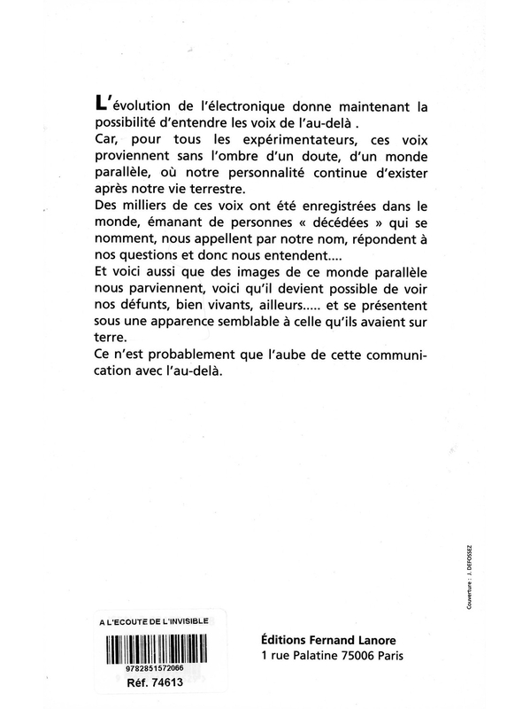 L'évolution de l'électronique donne maintenant la possibilité d'entendre les voix de l'au-delà. Car, pour tous les expérimentateurs, ces voix proviennent sans l'ombre d'un doute, d'un monde parallèle, où notre personnalité continue d'exister après notre vie terrestre. Des milliers de ces voix ont été enregistrées dans le monde, émanant de personnes décédées qui se nomment, nous appellent par notre nom, répondent à nos questions et donc nous entendent .... Et voici aussi que des images de ce monde parallèle nous parviennent, voici qu'il devient possible de voir nos défunts, bien vivants, ailleurs et se présentent sous une apparence semblable à celle qu'ils avaient sur terre. Ce n'est probablement que l'aube de cette communication avec l'au-delà.Simonet Monique Voir moins