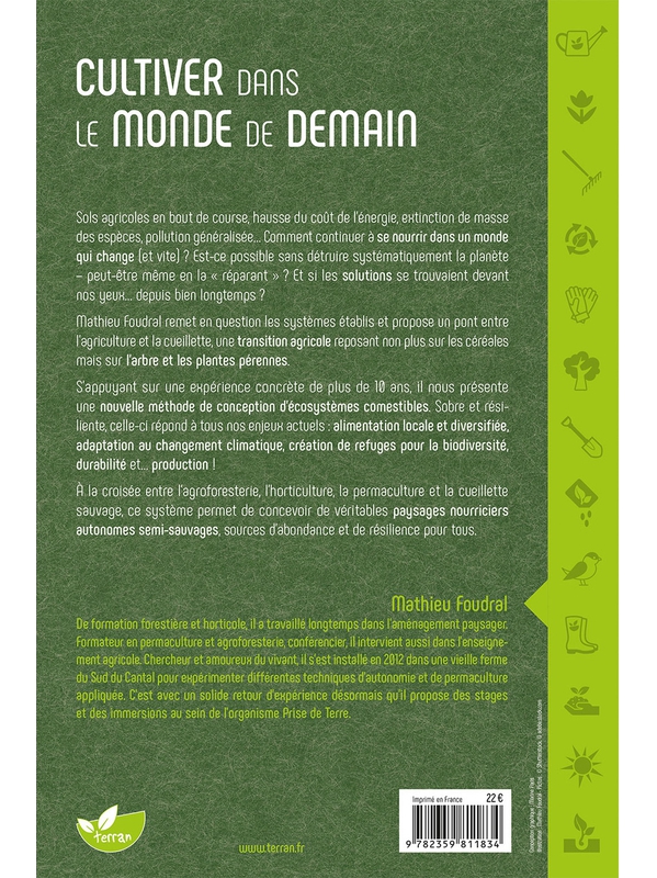 Sols agricoles en bout de course, hausse du coût de l’énergie, extinction de masse des espèces, pollution généralisée… Comment continuer à se nourrir dans un monde qui change (et vite) ? Est-ce possible sans détruire systématiquement la planète – peut-être même en la « réparant » ? Et si les solutions se trouvaient devant nos yeux… depuis bien longtemps ? Mathieu Foudral remet en question les systèmes établis et propose un pont entre l’agriculture et la cueillette, une transition agricole reposant non plus sur les céréales mais sur l’arbre et les plantes pérennes. S’appuyant sur une expérience concrète de plus de 10 ans, il nous présente une nouvelle méthode de conception d’écosystèmes comestibles. Sobre et résiliente, celle-ci répond à tous nos enjeux actuels : alimentation locale et diversifiée, adaptation au changement climatique, création de refuges pour la biodiversité, durabilité et… production ! À la croisée entre l’agroforesterie, l’horticulture, la permaculture et la cueillette sauvage, ce système permet de concevoir de véritables paysages nourriciers autonomes semi-sauvages, sources d’abondance et de résilience pour tous.Foudral Mathieu Voir moins