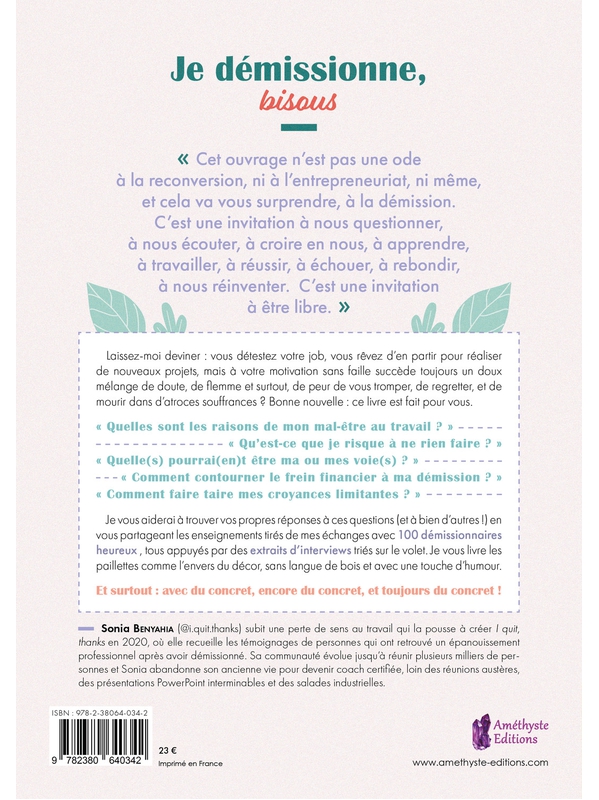 « Cet ouvrage n’est pas une ode à la reconversion, ni à l’entrepreneuriat, ni même, et cela va vous surprendre, à la démission. C’est une invitation à nous questionner, à nous écouter, à croire en nous, à apprendre, à travailler, à réussir, à échouer, à rebondir, à nous réinventer. C’est une invitation à être libre. » Laissez-moi deviner : vous détestez votre job, vous rêvez d’en partir pour réaliser de nouveaux projets, mais à votre motivation sans faille succède toujours un doux mélange de doute, de flemme et surtout, de peur de vous tromper, de regretter et de mourir dans d’atroces souffrances ? Bonne nouvelle : ce livre est fait pour vous. « Quelles sont les raisons de mon mal-être au travail ? », « Qu’est-ce que je risque à ne rien faire ? », « Quelle(s) pourrai(en)t être ma ou mes voie(s) ? », « Comment contourner le frein financier à ma démission ? », « Comment faire taire mes croyances limitantes ? » Je vous aiderai à trouver vos propres réponses à ces questions (et à bien d’autres !) en vous partageant les enseignements tirés de mes échanges avec 100 démissionnaires heureux, tous appuyés par des extraits d’interviews triés sur le volet. Je vous livre les paillettes comme l’envers du décor, sans langue de bois et avec une touche d’humour. Et surtout : avec du concret, encore du concret et toujours du concret !Benyahia Sonia Voir moins