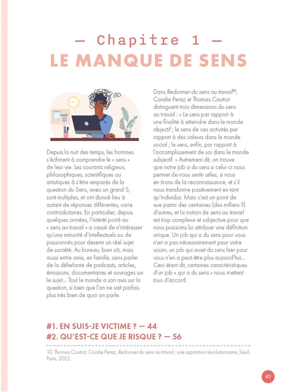 « Cet ouvrage n’est pas une ode à la reconversion, ni à l’entrepreneuriat, ni même, et cela va vous surprendre, à la démission. C’est une invitation à nous questionner, à nous écouter, à croire en nous, à apprendre, à travailler, à réussir, à échouer, à rebondir, à nous réinventer. C’est une invita