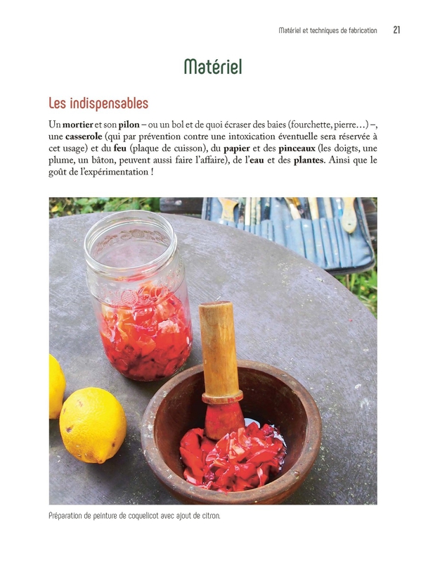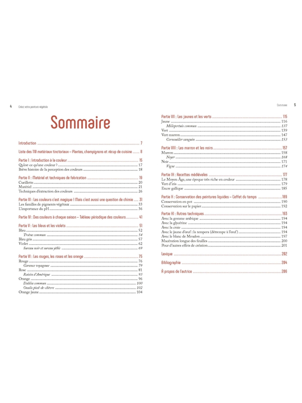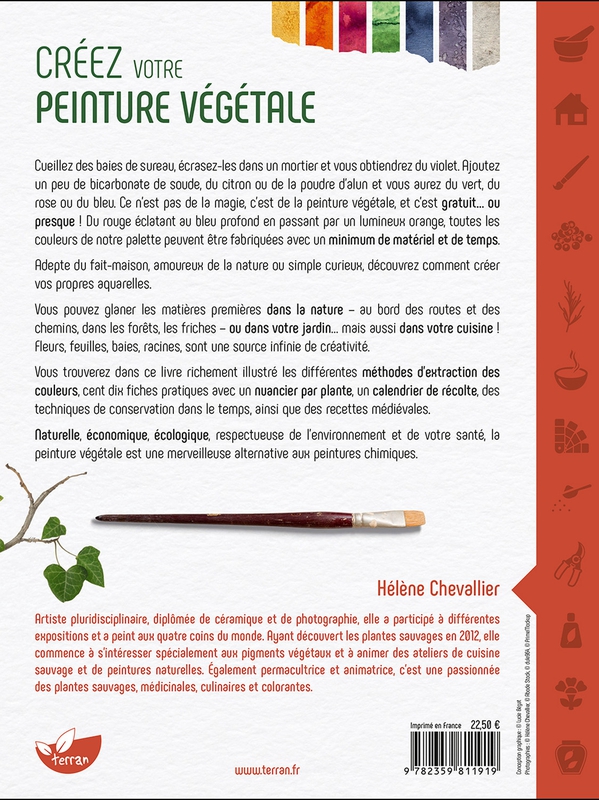 Cueillez des baies de sureau, écrasez-les dans un mortier et vous obtiendrez du violet. Ajoutez un peu de bicarbonate de soude, du citron ou de la poudre d’alun et vous aurez du vert, du rose ou du bleu. Ce n’est pas de la magie, c’est de la peinture végétale, et c’est gratuit… ou presque ! Du rouge éclatant au bleu profond en passant par un lumineux orange, toutes les couleurs de notre palette peuvent être fabriquées avec un minimum de matériel et de temps. Adepte du fait-maison, amoureux de la nature ou simple curieux, découvrez comment créer vos propres aquarelles. Vous pouvez glaner les matières premières dans la nature ou dans votre jardin… mais aussi dans votre cuisine ! Fleurs, feuilles, baies, racines, sont une source infinie de créativité. Vous trouverez dans ce livre richement illustré les différentes méthodes d’extraction des couleurs, cent dix fiches pratiques avec un nuancier par plante, un calendrier de récolte, des techniques de conservation dans le temps, ainsi que des recettes médiévales. Naturelle, économique, écologique, respectueuse de l’environnement et de votre santé, la peinture végétale est une merveilleuse alternative aux peintures chimiques.Chevallier Hélène Voir moins