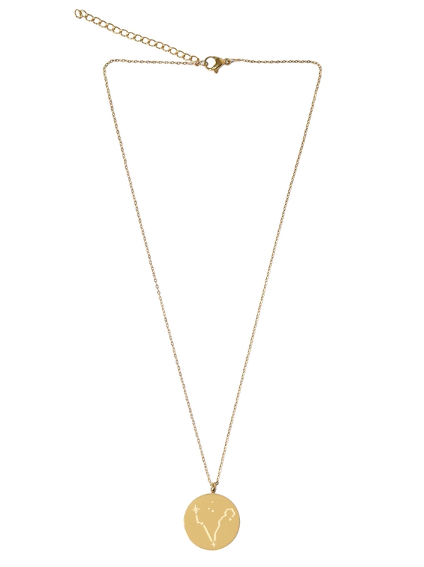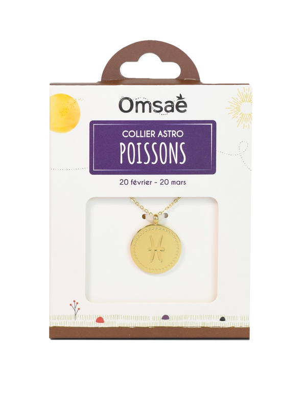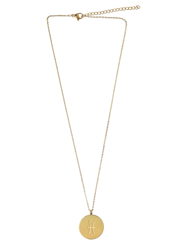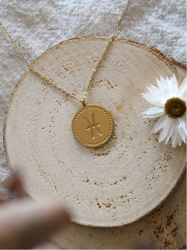 Collier composé d'une médaille gravée et d'une chaîne en acier inoxydable. Médaille gravée au recto et au verso avec le signe et la constellation Poisson. Chaîne ajustable d'une longueur de 40-45 cm.