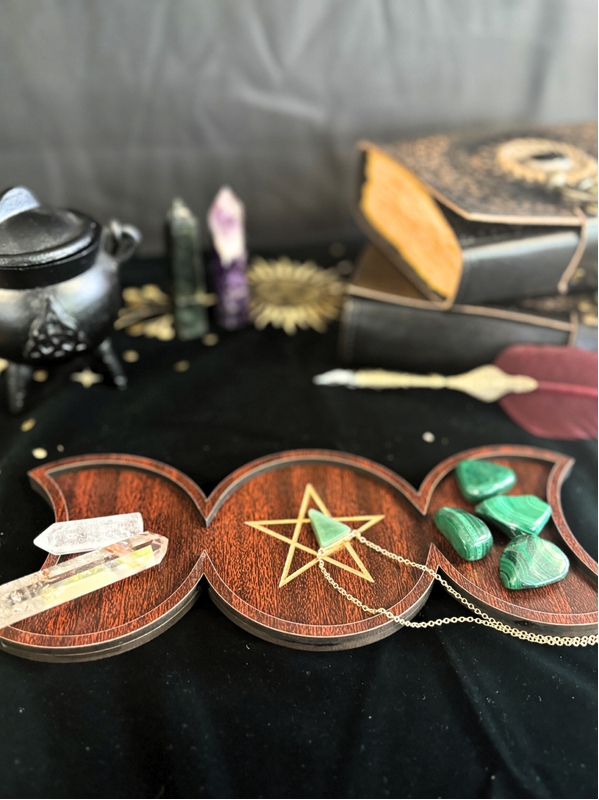 Ce support en bois en forme de Triple Lune ajoute une dimension spirituelle à votre décor. La Triple Lune incarne le cycle de la vie, de la féminité et de la puissance lunaire, symbolisant le changement, la croissance et le renouveau. Ce support est idéal pour ranger vos objets précieux tels que vos cristaux, bijoux ou autres accessoires.