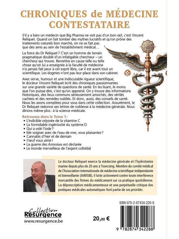 S’il y a bien un médecin que Big Pharma ne voit pas d’un bon oeil, c’est Vincent Reliquet. Quand on fait tomber des mythes lucratifs et qu’on prône des traitements naturels bon marché, on ne se fait pas que des amis au sein de l’establishment médical… La force du docteur Reliquet ? C’est un homme de terrain pragmatique doublé d’un infatigable chercheur – un chercheur qui trouve. Remettre en cause telle ou telle chose qu’on lui a enseignée à la faculté de médecine n’a jamais fait peur à cet esprit libre, car il est avant tout un scientifique. Les dogmes n’ont pas leur place dans son cabinet. Avec verve, humour et une indiscutable rigueur scientifique, le docteur Vincent Reliquet écrit des chroniques passionnantes sur une grande variété de questions de santé. En les lisant, le moins que l’on puisse dire, c’est qu’on apprend. On y trouve des informations historiques, des lieux communs sérieusement amochés, des vérités cachées et des remèdes oubliés. Et donc, aussi, des conseils de santé. Nous les avons compilées pour vous dans cette collection. Assurément, le docteur Reliquet redonne ses lettres de noblesse à la médecine générale. Nous dirions même plus : à la science médicale. Dans ce premier tome, Vincent Reliquet nous conte « l’odyssée » de la vitamine C, et il dévoile quelques données sur la vitamine D qui pourraient changer notre vie. Il nous explique nos réels besoins en iode et comment se soigner avec de l’eau de mer. Il aborde (sans tabou, vous l’aurez compris) la question du cannabis médicinal, vante l’oeuf et nous emmène jusqu’en Afrique noire pour nous parler des vertus de l’armoise. Enfin, l’argent colloïdal étant un remède extraordinaire mais interdit, il fallait bien qu’il en parle aussi.Reliquet Vincent Voir moins