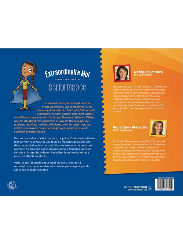 La plupart des enfants vivent un stress avant un examen, une compétition ou un événement important, c’est tout à fait normal ! Cependant, certains enfants accordent parfois trop d’importance à la réussite et appréhendent tellement la peur de l’échec que ces situations leur causent un niveau de stress démesuré : panique, angoisse, malaises physiques, pensées négatives, etc. C’est ce qui arrive à ceux et celles qui sont aux prises avec de l’anxiété de performance. Destiné aux enfants, ce guide d’intervention illustré leur permettra de trouver une foule de manières de calmer leur désir de perfection, leur peur de faire des erreurs ou la tendance à remettre à plus tard qui en découle parfois. Plusieurs exercices simples et imagés les aideront à modérer leurs insécurités et à avoir des attentes réalistes. Voilà un outil accessible pour aider les petits « héros » à reconnaître leur pleine valeur et à développer une plus grande confiance en leurs habiletés.Couture Nathalie,Marcotte Geneviève Voir moins