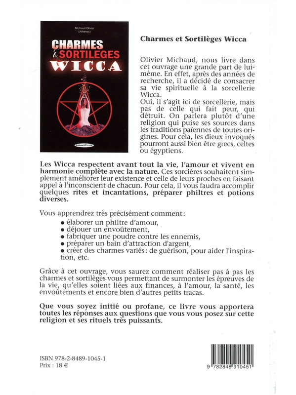 Olivier Michaud, nous livre dans cet ouvrage une grande part de lui-même. En effet, après des années de recherche, il a décidé de consacrer sa vie spirituelle à la sorcellerie Wicca. Oui, il s'agit ici de sorcellerie, mais pas de celle qui fait peur, qui détruit. On parlera plutôt d'une religion qui puise ses sources dans les traditions païennes de toutes origines. Pour cela, les dieux invoqués pourront aussi bien être grecs, celtes ou égyptiens. Les Wicca respectent avant tout la vie, l'amour et vivent en harmonie complète avec la nature. Ces sorcières souhaitent simplement améliorer leur existence et celle de leurs proches en faisant appel à l'inconscient de chacun. Pour cela, il vous faudra accomplir quelques rites et incantations, préparer philtres et potions diverses. Vous apprendrez très précisément comment - élaborer un philtre d'amour, - déjouer un envoûtement, - fabriquer une poudre contre les ennemis - préparer un bain d'attraction d'argent, - créer des charmes variés : de guérison, pour aider l'inspiration, etc. Grâce à cet ouvrage, vous saurez comment réaliser pas à pas les charmes et sortilèges vous permettant de surmonter les épreuves de la vie, qu'elles soient liées aux finances, à l'amour, la santé, les envoûtements et encore bien d'autres petits tracas. Que vous soyez initié ou profane, ce livre vous apportera toutes les réponses aux questions que vous vous posez sur cette religion et ses rituels très puissants.Michaud Olivier Voir moins