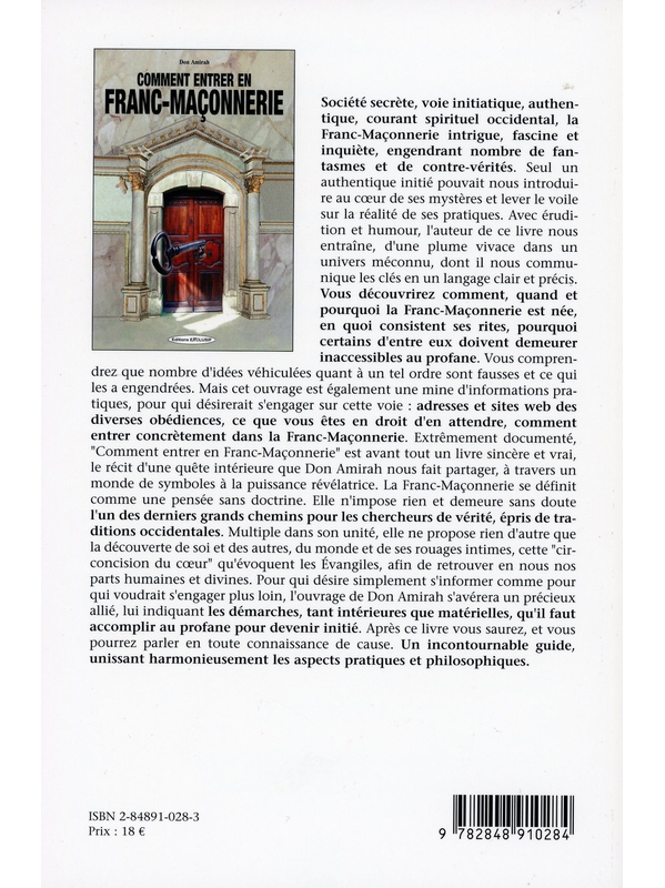 Société secrète, voie initiatique, authentique, courant spirituel occidental, la Franc-Maçonnerie intrigue, fascine et inquiète, engendrant nombre de fantasmes et de contre-vérités. Seul un authentique initié pouvait nous introduire au cœur de ses mystères et lever le voile sur la réalité de ses pratiques. Avec érudition et humour, l'auteur de ce livre nous entraîne, d'une plume vivace dans un univers méconnu, dont il nous communique les clés en un langage clair et précis. Vous découvrirez comment, quand et pourquoi la Franc-Maçonnerie est née, en quoi consistent ses rites, pourquoi certains d'entre eux doivent demeurer inaccessibles au profane. Vous comprendrez que nombre d'idées véhiculées quant à un tel ordre sont fausses et ce qui les a engendrées. Mais cet ouvrage est également une mine d'informations pratiques, pour qui désirerait s'engager sur cette voie : adresses et sites web des diverses obédiences, ce que vous êtes en droit d'en attendre, comment entrer concrètement dans la Franc-Maçonnerie. Extrêmement documenté, Comment entrer en Franc-Maçonnerie est avant tout un livre sincère et vrai, le récit d'une quête intérieure que Don Amirah nous fait partager, à travers un monde de symboles à la puissance révélatrice. La Franc-Maçonnerie se définit comme une pensée sans doctrine. Elle n'impose rien et demeure sans doute l'un des derniers grands chemins pour les chercheurs de vérité, épris de traditions occidentales. Multiple dans son unité, elle ne propose rien d'autre que la découverte de soi et des autres, du monde et de ses rouages intimes, cette circoncision du cœur qu'évoquent les Evangiles, afin de retrouver en nous nos parts humaines et divines. Pour qui désire simplement s'informer comme pour qui voudrait s'engager plus loin, l'ouvrage de Don Amirah s'avérera un précieux allié, lui indiquant les démarches, tant intérieures que matérielles, qu'il faut accomplir au profane pour devenir initié. Après ce livre vous saurez, et vous pourrez parler en toute connaissance de cause. Un incontournable guide, unissant harmonieusement les aspects pratiques et philosophiques.Amirah Don Voir moins
