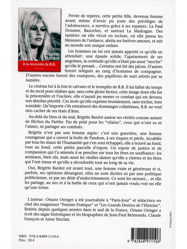 Privée de repères, cette petite fille, devenue femme avant même d'avoir pu jouir des privilèges de l'adolescence, a survécu grâce à ses repaires : La Paul Doumer, Bazoches, et surtout La Madrague. Des tanières où elle vécut en recluse, où elle pansa les blessures de l'enfance, abrita ses furtives amours, et mit au monde son unique enfant. Les hommes ne lui ont jamais apporté ce qu'elle en attendait : une épaule solide, l'apaisement de ses angoisses, la certitude qu'elle n'était pas aussi moche qu'elle le pensait... Certains ont été des jalons. D'autres furent relégués au rang d'hommes de compagnie. D'autres encore furent des crampons, des papillons de nuit attirés par sa lumière. Le cinéma fut à la fois le calvaire et le tremplin de BB. Il lui fallut du temps et du recul pour réaliser que, sans cette gloire factice, cette image dont elle fut la prisonnière et l'esclave, elle n'aurait pu mener ce combat qui est devenu son absolue priorité. Ces mots qu'elle exprime brutalement, sans tricher, font scandale. Qu'importe s'ils entraînent des dommages collatéraux, BB ne veut rien cacher de ses états d'âme. Au-delà du bien et du mal, Brigitte Bardot assène ses vérités comme autant de flèches du Parthe. Pas de pitié pour les vilains, ceux qui n'ont su ni l'aimer, ni partager ses combats. Brigitte n'est pas une femme aigrie : c'est une guerrière, une femme courageuse qui a ouvert la boîte de Pandore, à ses risques et périls. Accablée par tous les maux de l'humanité qui s'en sont échappés, elle a trouvé au fond, tout au fond, cette petite parcelle d'espoir. Un espoir de justice et de compassion qui l'a amenée à se pencher sur tous les êtres en souffrance : les animaux, bien sûr, mais aussi les vieilles dames qu'elle a chéries et les êtres qui l'ont émue et qu'elle a réconfortés tout au long de sa vie. Oui, Brigitte Bardot est avant tout, une femme vraie et généreuse et si, parfois, ses opinions dérangent, elles ne sont dictées ni par une politique politicienne, ni par un désir d'endoctrinement. Ce sont les siennes, et elle les partage, au nez et à la barbe de ceux qui n'ont jamais voulu voir en elle qu'une icône.Oringer Oriane Voir moins