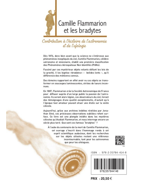 En 1874, bien avant que la science ne s'intéresse aux phénomènes inexpliqués du ciel, Camille Flammarion, célèbre astronome et visionnaire, établit une première classification des Phénomènes Aérospatiaux Non Identifiés (PANs). Fasciné par ces mystérieux bolides défiant les lois de la gravité, il les baptise « bradytes » – des « bolides lents » qu'il différencie des météores connus. Comme M. Méline, à Dijon, des témoins rapportent avoir vu ces objets se transformer en soucoupes luminescentes, striées de lueurs inconnues. Dès 1887, Flammarion crée la Société Astronomique de France pour collecter ces témoignages intrigants, posant ainsi les bases d'une véritable enquête scientifique sur des phénomènes défiant la physique conventionnelle. Aujourd'hui, grâce aux archives inédites révélées par Jonathan Giné, ces observations oubliées refont surface. Ce livre est une plongée inédite dans les mystères célestes qu'étudiait Flammarion, et nous interroge encore un siècle plus tard : qu’étaient ces fameux « bradytes » ? À l'aube du centenaire de sa mort, cet ouvrage s'inscrit dans l'hommage rendu à Camille Flammarion, l'esprit scientifique audacieux, dont les recherches sur les objets célestes restent une référence incontournable pour les astronomes comme pour les ufologues.Giné Jonathan Voir moins
