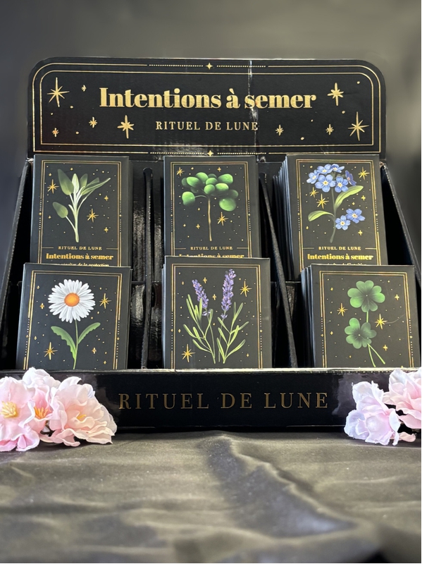 Déclinés en six designs uniques, chaque intention contient des graines qui donneront naissance à une fleur correspondant à une thématique : Amour, Sérénité, Chance, Fortune, Protection et Intuition. En les plantant, vous laissez éclore des fleurs porteuses de sens, chacune symbolisant un aspect précieux de la vie.
