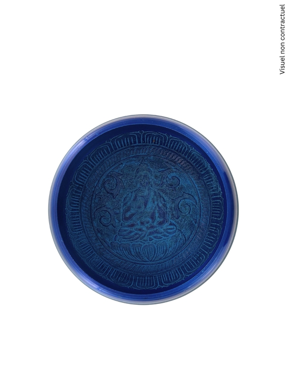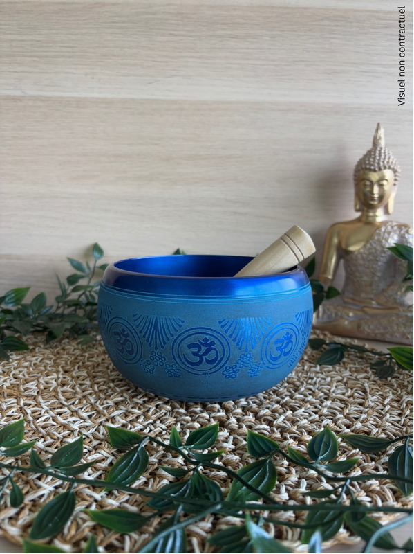 Laissez-vous porter par les vibrations apaisantes de ce bol chantant en aluminium, d'un bleu profond rehaussé du symbole sacré Om. D'un diamètre d'environ 14 cm, ce bo Voir plus