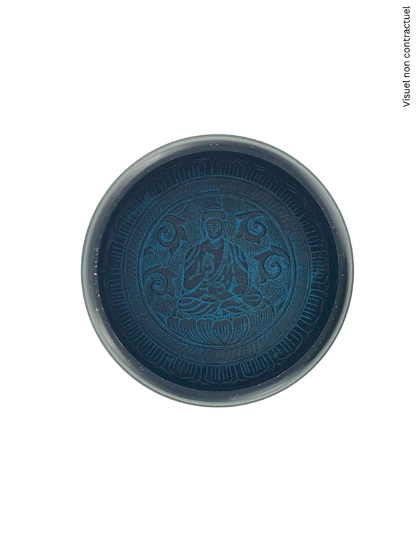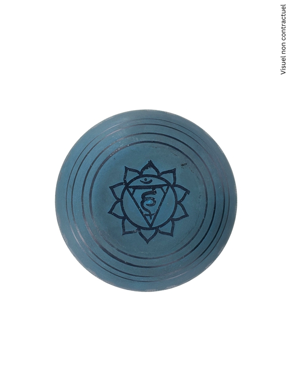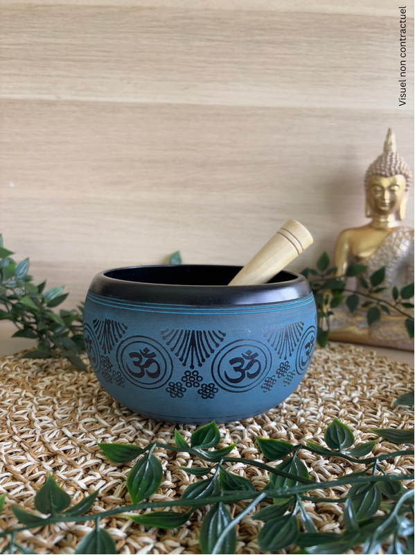 Laissez-vous porter par les vibrations apaisantes de ce bol chantant en aluminium noir et bleu rehaussé du symbole sacré Om. D'un diamètre d'environ 14 cm, ce bol alli Voir plus