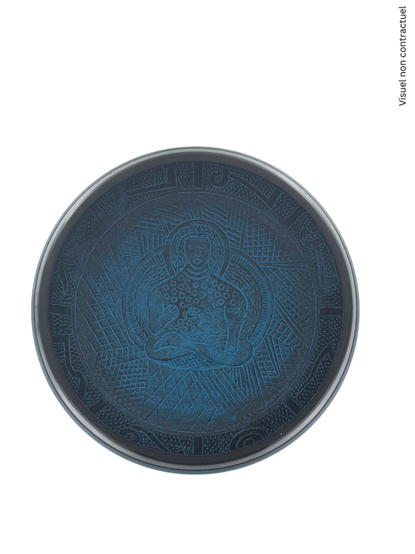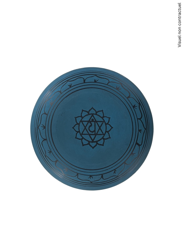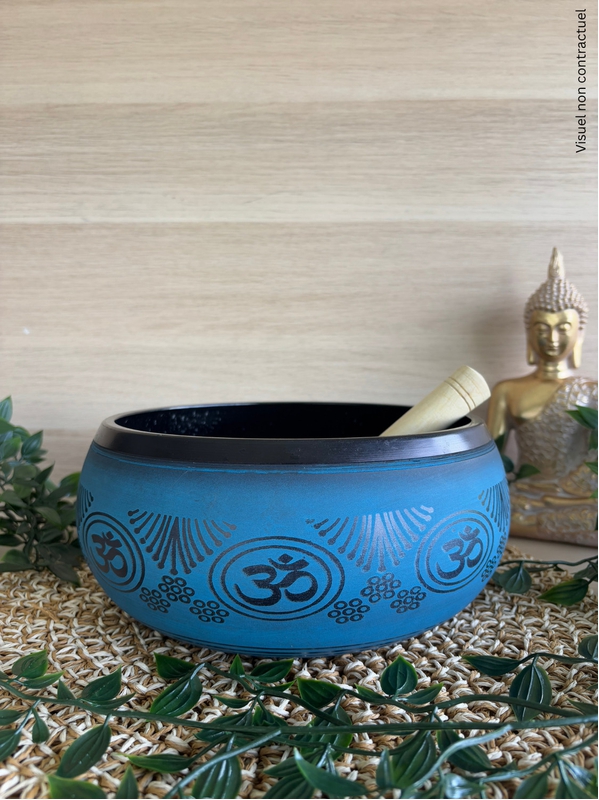 Laissez-vous porter par les vibrations apaisantes de ce bol chantant en aluminium noir et bleu rehaussé du symbole sacré Om. D'un diamètre d'environ 20 cm, ce bol alli