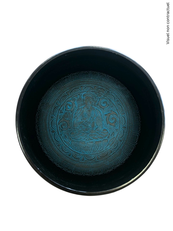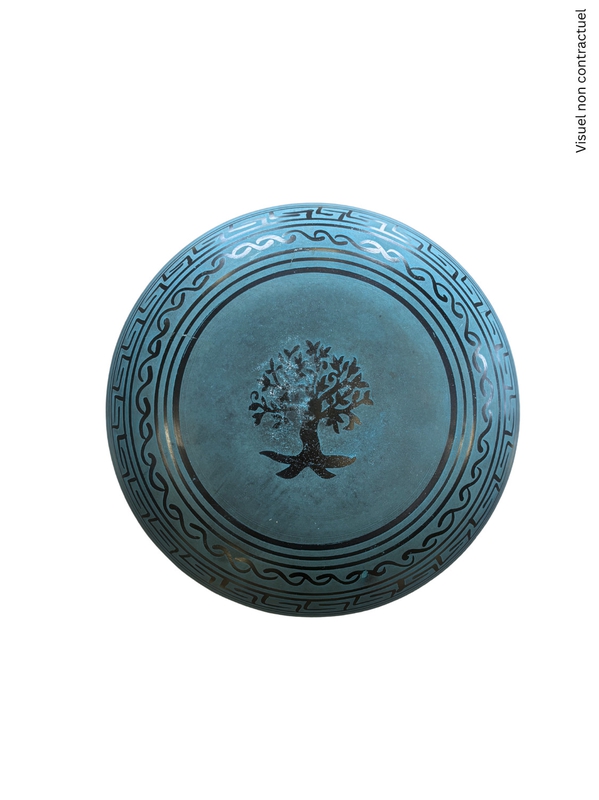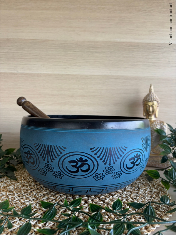 Laissez-vous porter par les vibrations apaisantes de ce bol chantant en aluminium noir et bleu rehaussé du symbole sacré Om. D'un diamètre d'environ 25 cm, ce bol alli