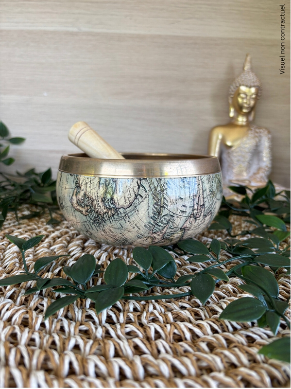 Explorez la résonance du monde avec ce bol chantant en laiton orné d’un motif carte du monde. Ce bol rend hommage à la richesse et à l’universalité des traditions spiritue