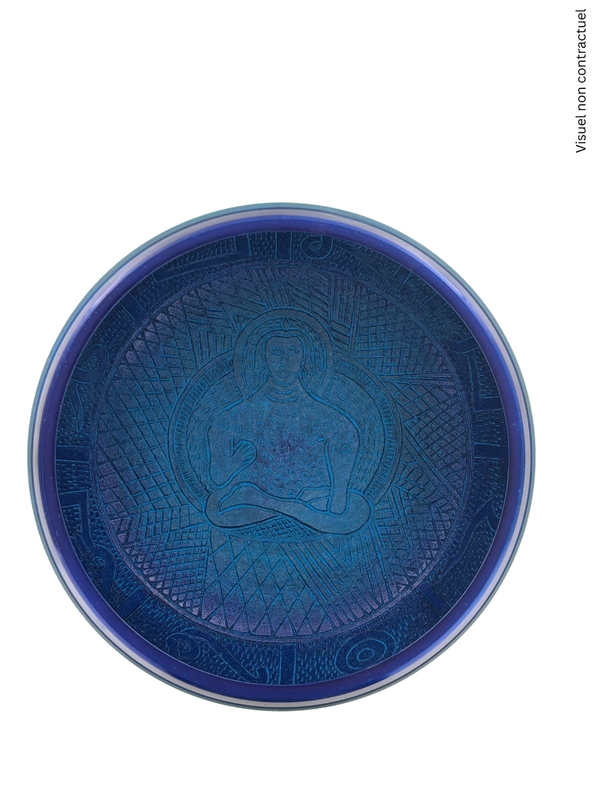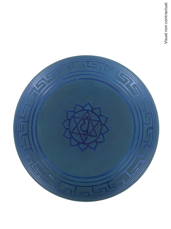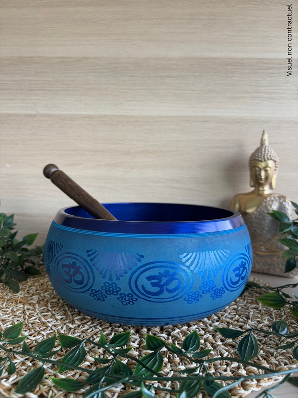 Laissez-vous porter par les vibrations apaisantes de ce bol chantant en aluminium, d'un bleu profond rehaussé du symbole sacré Om. D'un diamètre d'environ 20 cm, ce bo