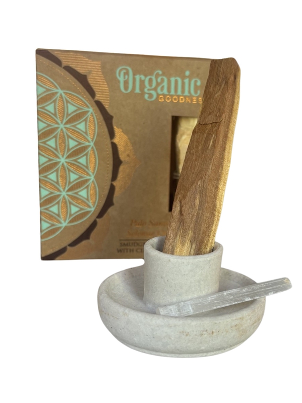 Ce kit de fumigation associe un bâton de Palo Santo et une baguette de sélénite, réunis par un lien orné du symbole de la Fleur de Vie. Ensemble, ils favorisent l’ancra