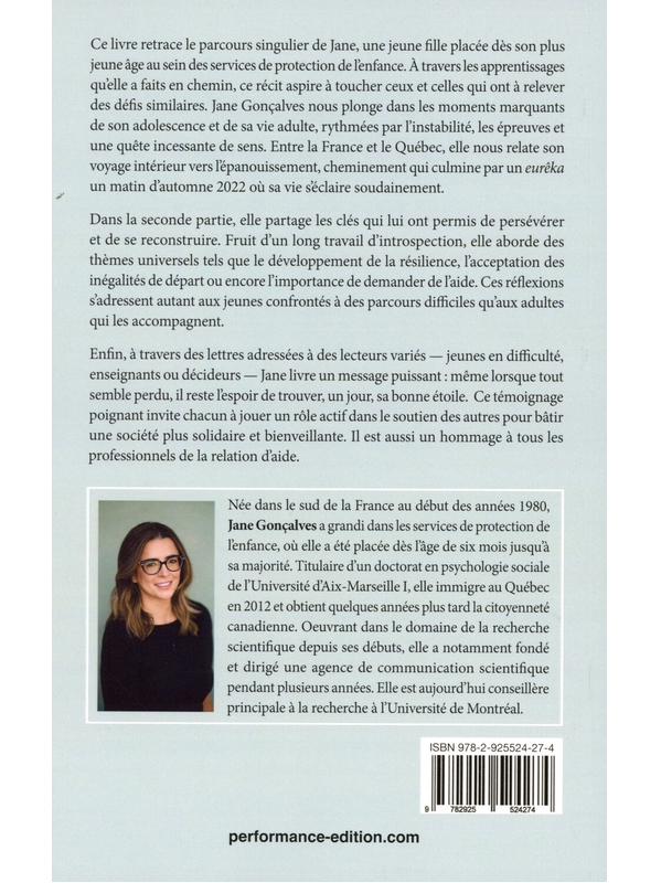 Ce livre retrace le parcours singulier de Jane, une jeune fille placée dès son plus jeune âge au sein des services de protection de l’enfance. À travers les apprentissages clés qu’elle a faits en chemin, ce récit aspire à toucher ceux et celles qui ont à relever des défis similaires. Jane Gonçalves Voir plus