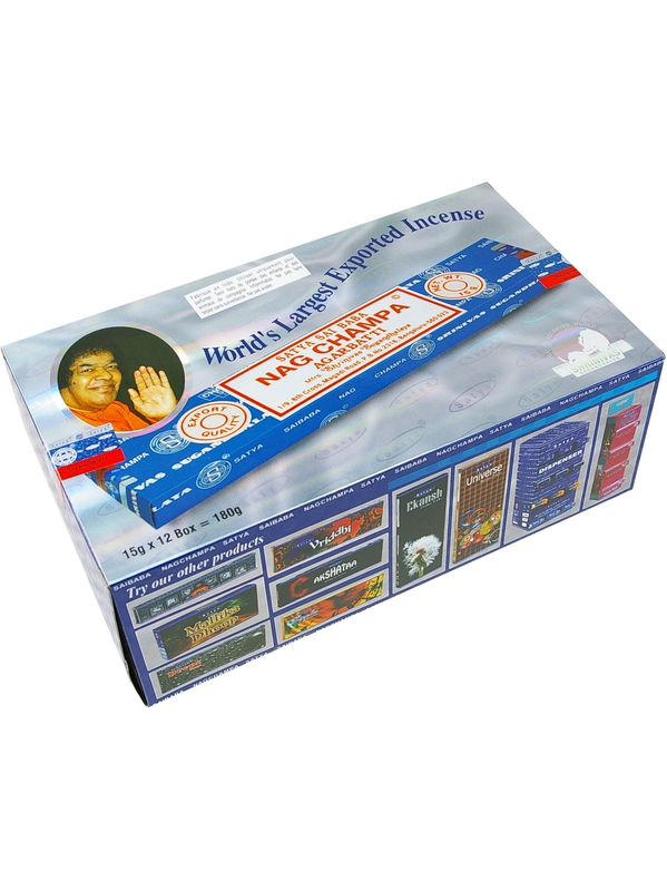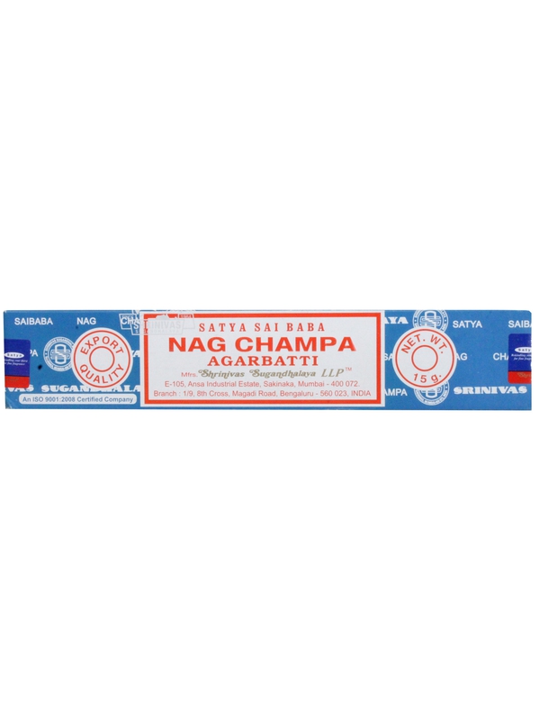 La fameuse boîte bleue est l'encens indien le plus vendu à travers le monde. Le masala du Nag Champa contient 160 produits aromatiques, notamment la fleur jaune d'un arbre de l'Himalaya, le Michelia Champaka, qui lui procure son parfum caractéristique. L'encens au Champaka est traditionnellement uti