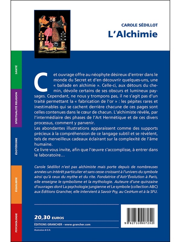 Origine et histoire de l’alchimie, le langage secret, le Mutus Liber et le Tarot, la Pierre Philosophale, l’Œuvre au Rouge, l’alchimie de l’âme et C. G. Jung, le Rosarium Philosophorum, Fulcanelli et Eugène Canseliet, l’énigme, Andreas Libavius, quelques pensées et citations de l’Art d’Hermès, les sceaux des philosophes et leur devise, les symboles hermétiques, etc. Broché 15,5 x 23 - Illustrations N&B - 322 pagesSédillot Carole Voir moins