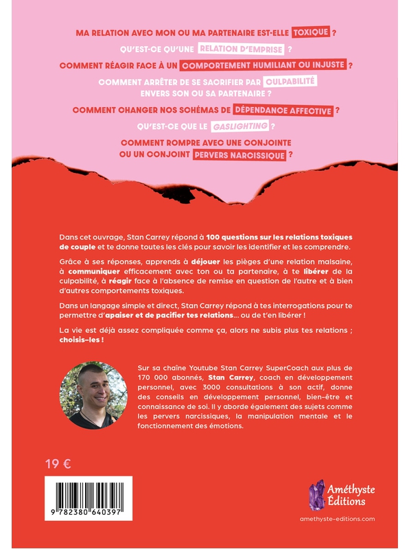 Ma relation avec mon ou ma partenaire est-elle toxique ? Qu’est-ce qu’une relation d’emprise ? Comment réagir face à un comportement humiliant ou injuste ?Comment arrêter de se sacrifier par culpabilité envers son ou sa partenaire ? Comment changer nos schémas de dépendance affective ? Qu’est-ce que le gaslighting ? Comment rompre avec une conjointe ou un conjoint pervers narcissique ?Dans cet ouvrage, Stan Carrey répond à 100 questions sur les relations toxiques de couple et te donne toutes les clés pour savoir les identifier et les comprendre. Grâce à ses réponses, apprends à déjouer les pièges d’une relation malsaine, à communiquer efficacement avec ton ou ta partenaire, à te libérer de la culpabilité, à réagir face à l’absence de remise en question de l’autre et à bien d’autres comportements toxiques. Dans un langage simple et direct, Stan Carrey répond à tes interrogations pour te permettre d’apaiser et de pacifier tes relations… ou de t’en libérer ! La vie est déjà assez compliquée comme ça, alors ne subis plus tes relations , choisis-les !Carrey Stan Voir moins